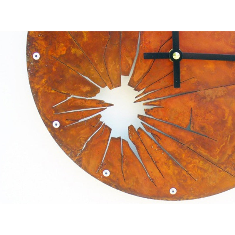 Den mest slående funktionen hos denna klocka är den intressanta krossat glas-effekten i mitten. Istället för en traditionell centrum har klockan en utskuren form som ser ut som ett krossat glas, vilket ger en dynamisk och nästan dramatisk känsla. Denna detalj gör att klockan inte bara visar tiden, utan också berättar en historia. De svarta visarna kontrasterar skarpt mot den rostiga, orangea bakgrunden och gör det lätt att avläsa tiden, trots den avantgardistiska designen. Varje klocka är unik med sin egen prägel av rost och "sprickor", vilket garanterar att du får ett exemplar som ingen annan har.