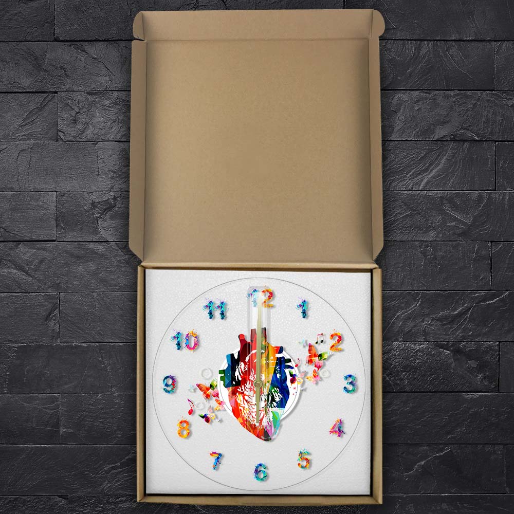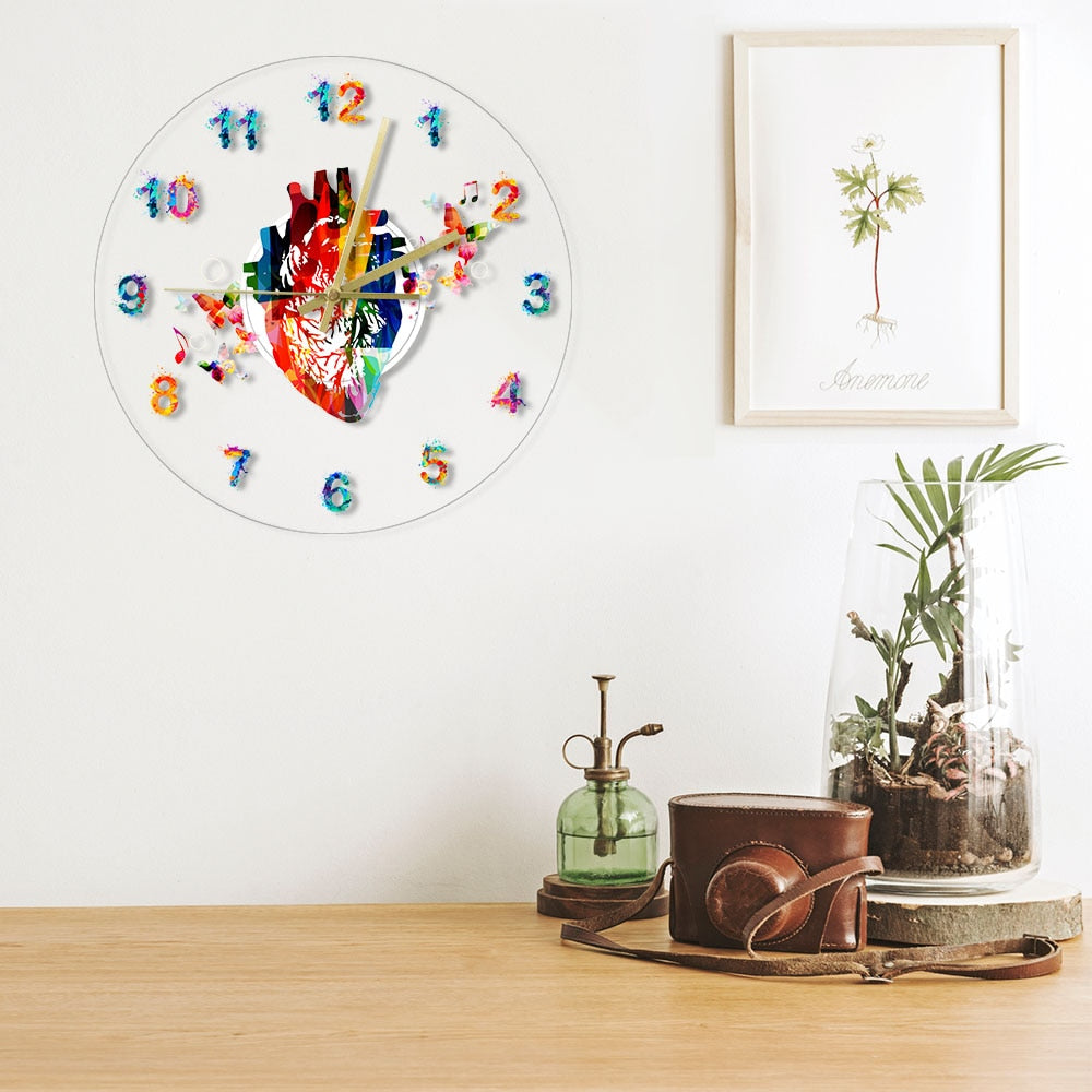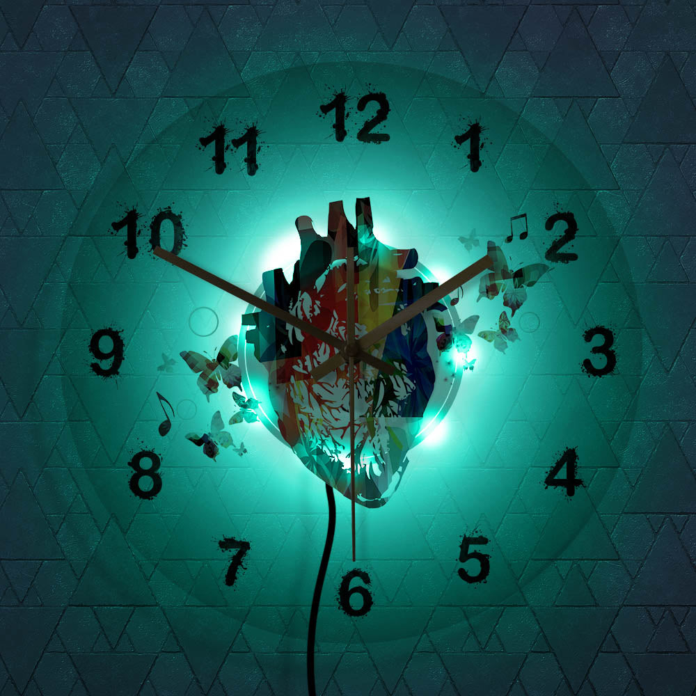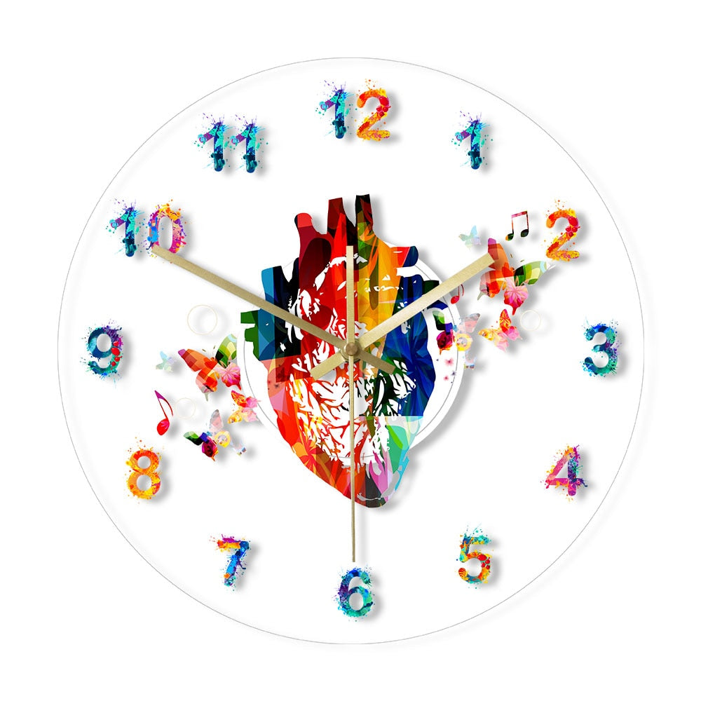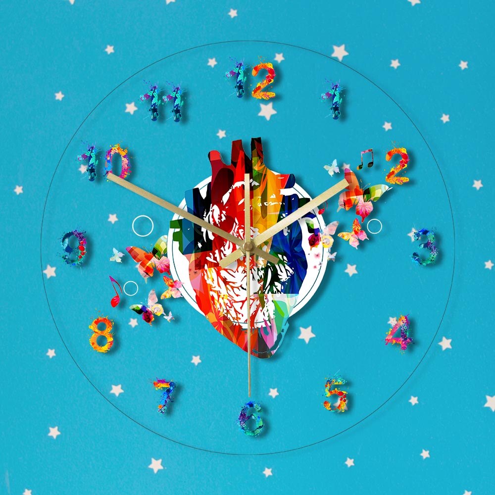Denna fantastiska klocka är tillverkad av högkvalitativ akryl, vilket ger den en modern och stilren känsla samtidigt som den är hållbar. Det anatomiska hjärtat i mitten är fyllt med en explosion av färger, och de spraymålade siffrorna runt om matchar den lekfulla estetiken. De små fjärilarna och musiknoterna som flyger runt bidrar till en drömlik och inspirerande atmosfär. Med LED-belysningen kan du enkelt läsa av tiden även i mörker, och den skapar ett mjukt och behagligt sken som förhöjer stämningen i rummet. Det är den perfekta kombinationen av funktion och konstnärlig uttryck.