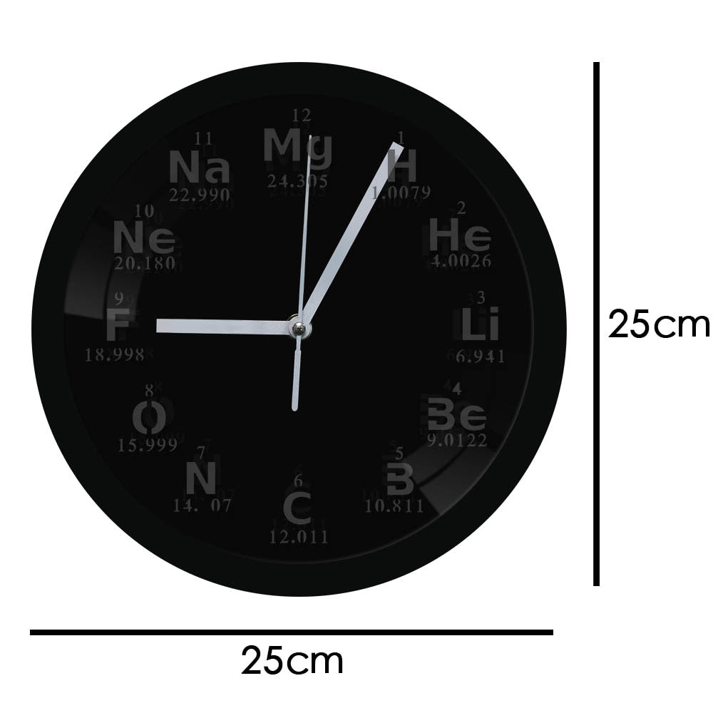 Varje siffra på klockan har ersatts av ett grundämne som matchar timmen. Till exempel, klockan 12 representeras av Magnesium (Mg), klockan 1 av Väte (H), och så vidare. Under varje grundämnesymbol hittar du dess atomnummer och atommassa, vilket ger en extra pedagogisk dimension till denna redan fascinerande klocka. De lysande lila LED-visarna rör sig smidigt över urtavlan och indikerar tiden med precision, dag som natt. Denna LED-väggklocka med periodiska systemet är mer än bara en tidsmätare – den är en hyllning till kemins underbara värld.