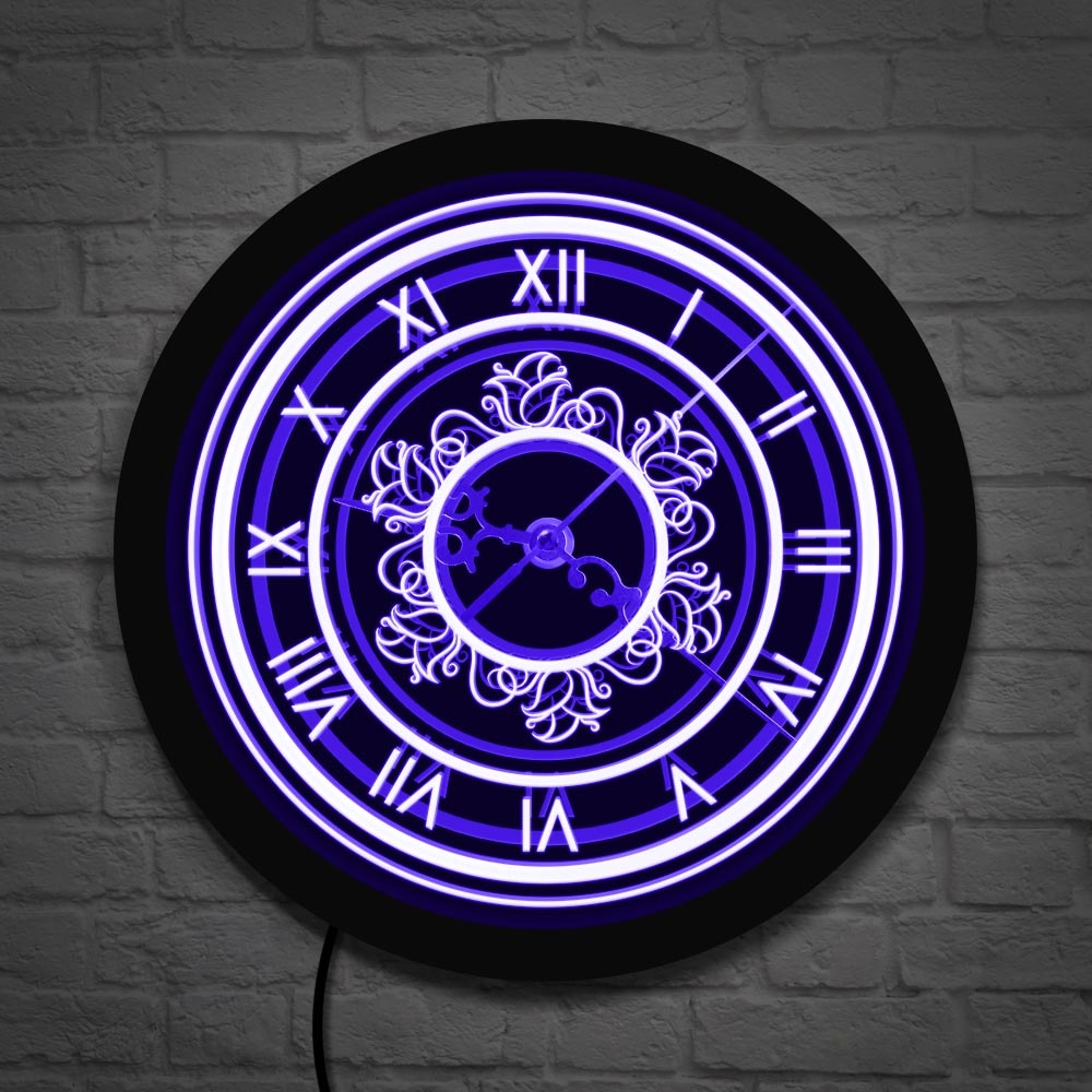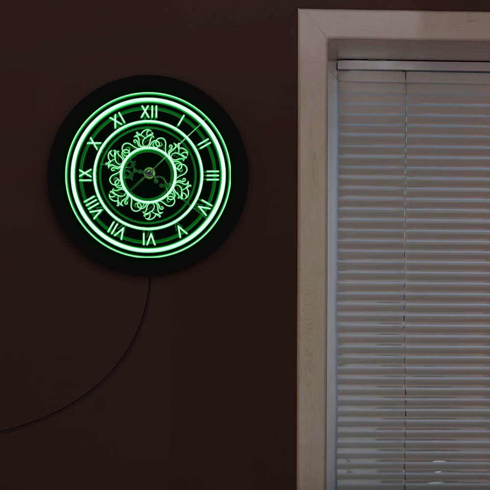 Denna klocka är designad för att sticka ut. Med sin svarta ram och de lysande lila LED-detaljerna skapar den en dramatisk kontrast mot vilken vägg som helst, särskilt mot en ljusare bakgrund som tegelväggen på bilden. De stora, tydliga romerska siffrorna gör det enkelt att läsa av tiden, samtidigt som den detaljerade urtavlan lägger till en touch av vintage-charm. Denna klocka är mer än bara en tidsmätare; den är en samtalspunkt, en stämningshöjare och en del av ditt hems personlighet. Låt den bli mittpunkten i ditt vardagsrum, sovrum eller kontor och njut av den unika atmosfär den skapar.