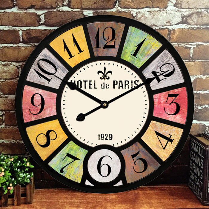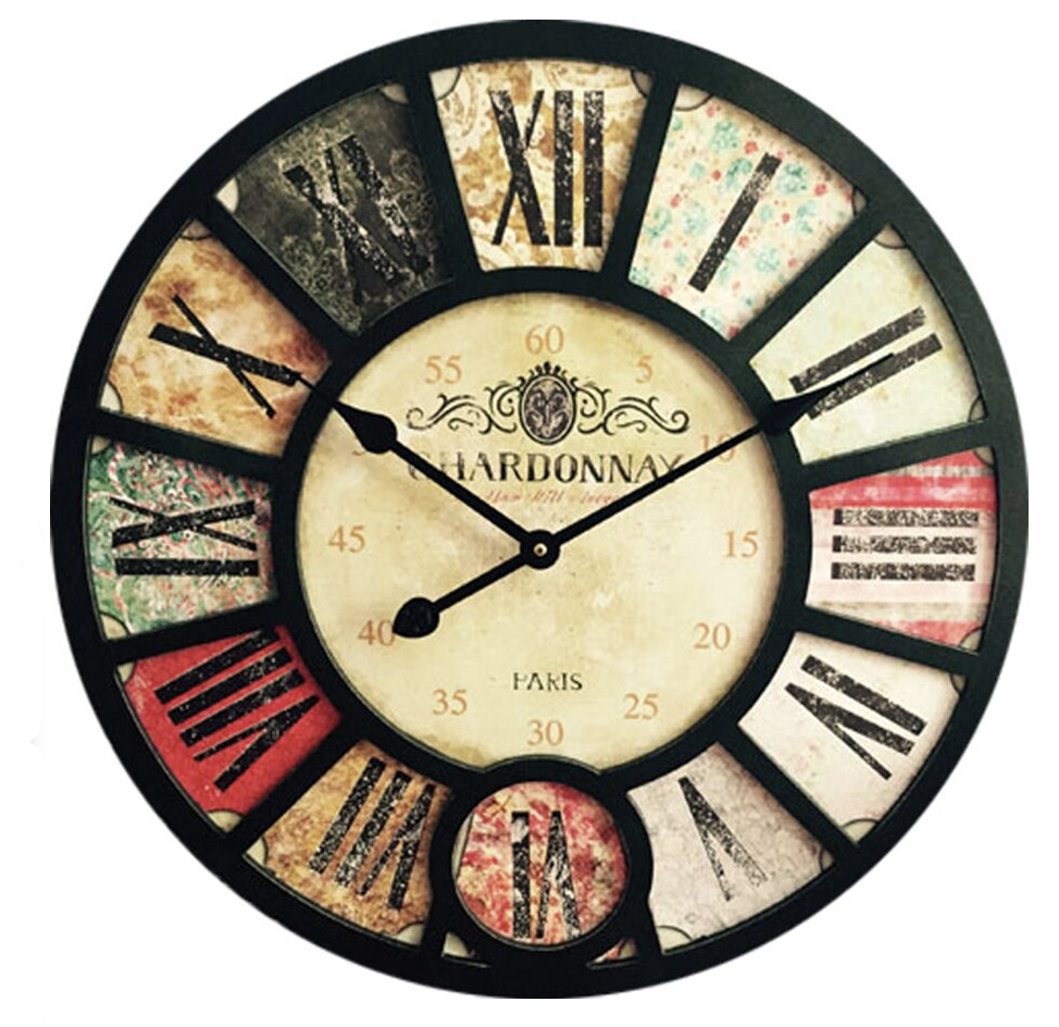 Varje aspekt av denna stora vintage väggklocka har noggrant utformats för att återspegla en autentisk retrokänsla. Den svarta ramen framhäver de unika urtavlesegmenten, där varje siffra har sin egen distinkta bakgrund – från antika kartmönster till blommiga inslag och djärva röda accenter. I mitten hittar du texten "CHARDONNAY PARIS", vilket ger en subtil nick till fransk elegans och vintagevinflaskors estetik. Visarna är klassiskt utformade för att komplettera den övergripande designen. Detta är mer än bara en klocka; det är en berättelse som väntar på att berättas i ditt hem, och den kommer garanterat att dra blickarna till sig och starta intressanta samtal.