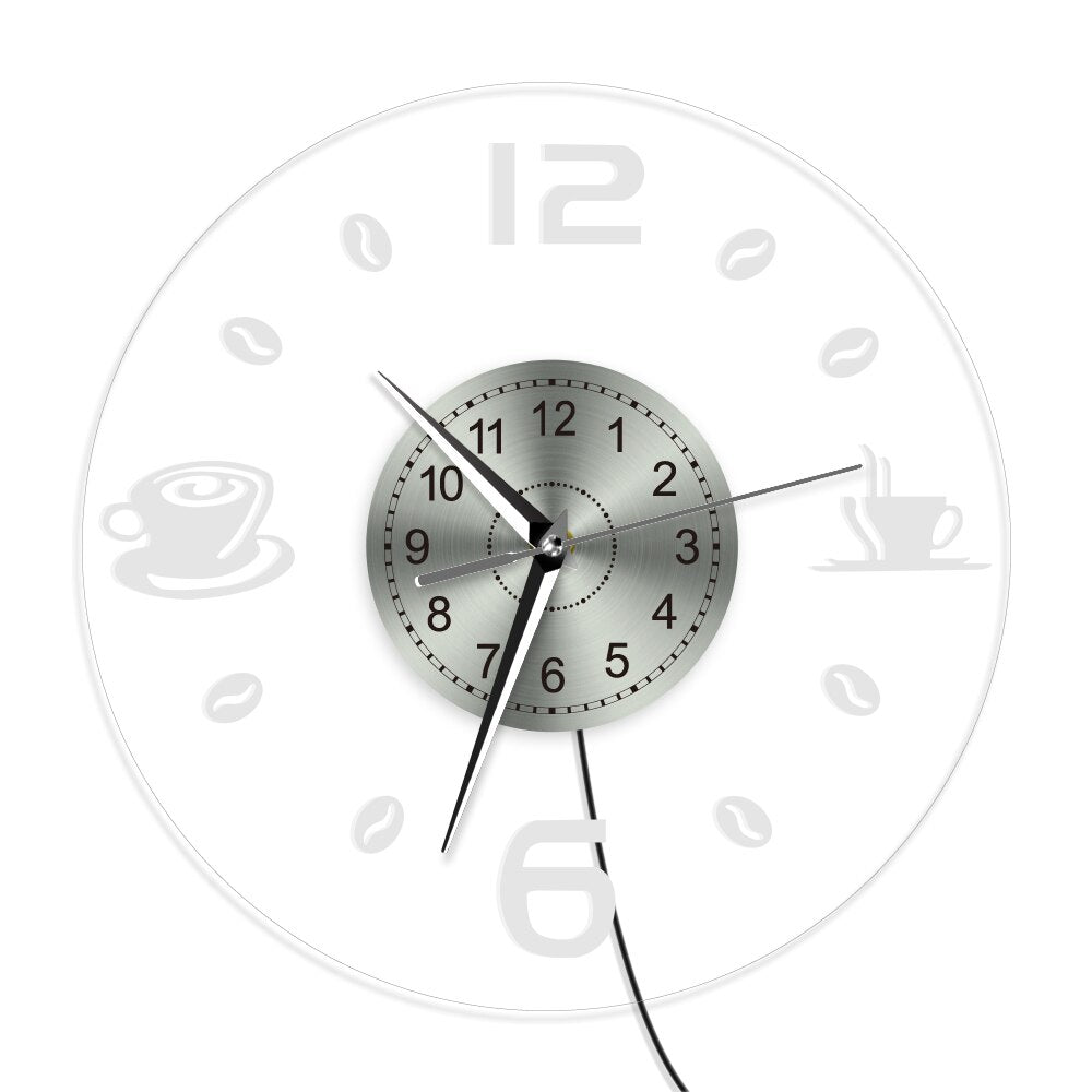 Upplev elegans och funktionalitet med vår Upplyst väggklocka för café kaffetema. Designad för att försköna ditt hem och hålla tiden med stil, kombinerar den raffinerad design med praktisk användbarhet.