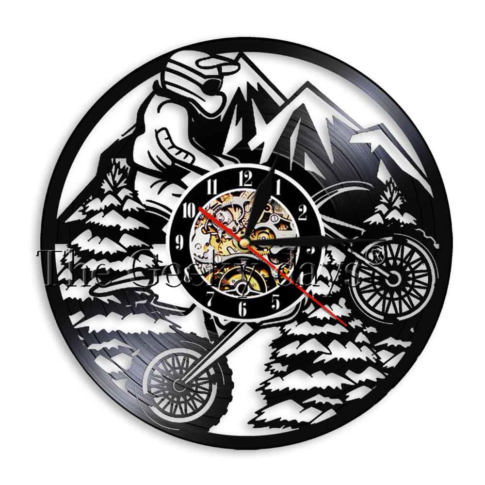 Letar du efter den perfekta presenten till motorcykelfantasten, eller kanske en riktigt cool detalj till ditt eget hem? Denna fantastiska väggklocka av vinylskiva med motorcykel är mer än bara en tidsvisare; den är ett konstverk som fångar spänningen med extremsport. Föreställ dig den hängande i garaget, vardagsrummet eller kanske i tonåringens rum. Den svarta silhuetten av motorcykeln och föraren som utför ett vågat hopp över bergen, tillsammans med de stiliserade träden, skapar en dynamisk och äventyrlig känsla. Det är en present som garanterat kommer att imponera och väcka samtal!