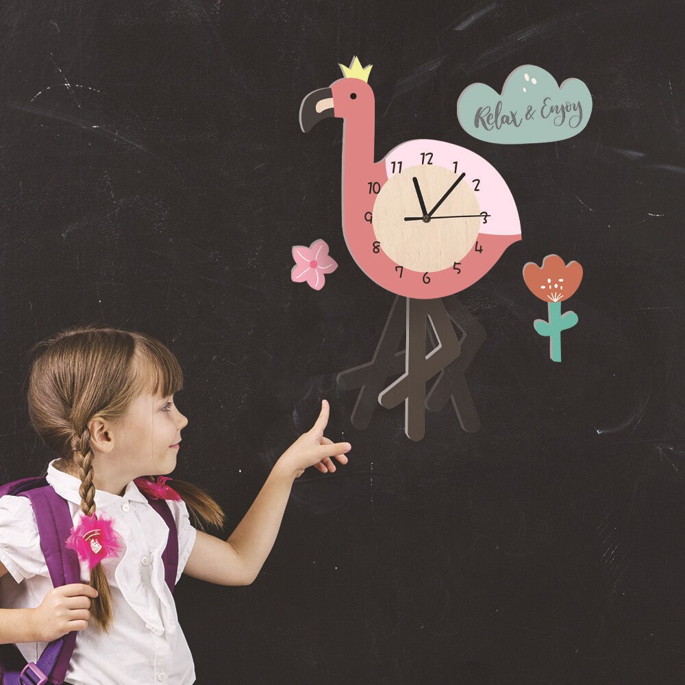 Detaljer som Gör Denna Väggklocka för Barn med Flamingo Motiv Unik