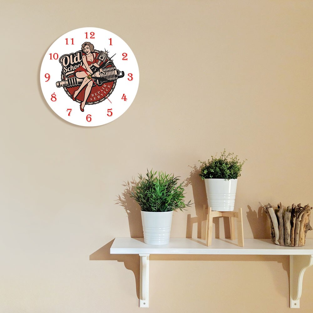 Är du trött på tråkiga väggklockor som bara visar tiden? Vår unika väggklocka i old school pin-up stil är mer än bara ett urverk – den är ett statement! Med en charmig pin-up tjej som lutar sig mot motordelar och texten "Old School Repair Service", för den tankarna till 50-talets bilverkstäder och rockabilly-kultur. Denna klocka är perfekt för dig som älskar vintage, retro och en touch av kitsch. Föreställ dig den hängande i ditt garage, mancave, kök eller vardagsrum, och hur den omedelbart blir ett samtalsämne bland dina vänner. Den ger en personlig och lekfull atmosfär, och visar att du har en känsla för unik stil.